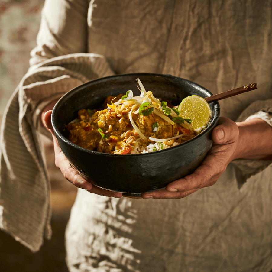 This mild and tangy Balinese curry is no ordinary curry. It’s a deliciously moreish sauce of crushed peanuts, coconut milk and zingy lime with rich spices, and all proceeds from its sales are helping to feed families in need.