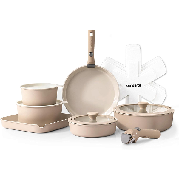 The Sensarte 17 piece Ceramic Cookware Set in Almond Beige continues the theme with its sleek finish and even heat distribution, making cooking both beautiful and effortless. It’s the kind of set that feels at home in any kitchen styled with timber and cream tones.